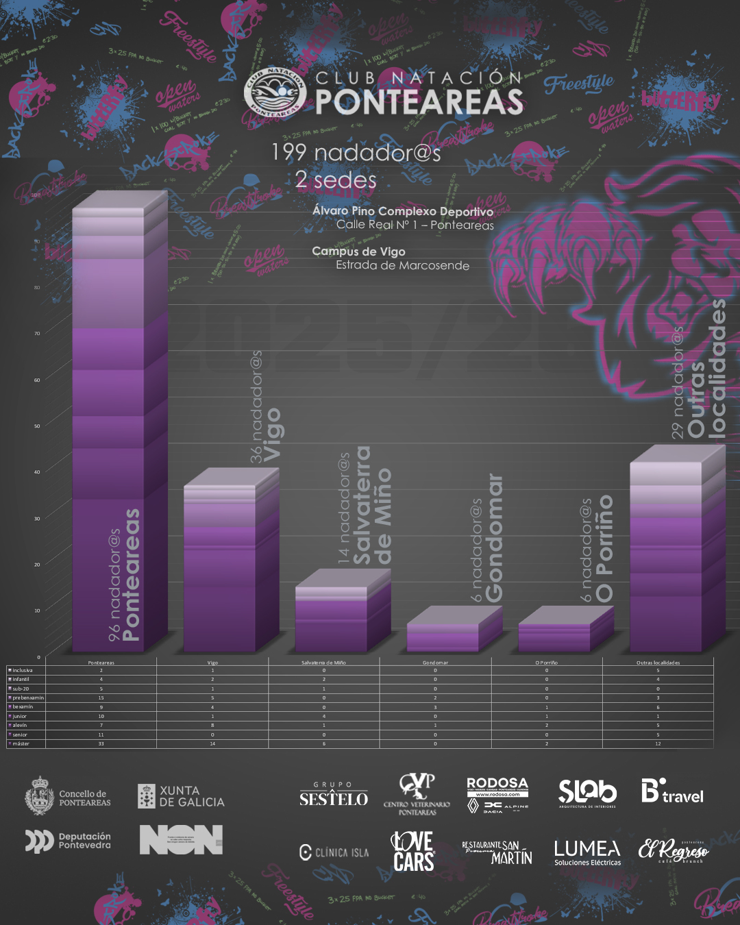 O noso club é un referente da natación galega, presente en tódalas categorías federadas. Nesta tempada contamos con 185 licenzas e seguimos a medrar.